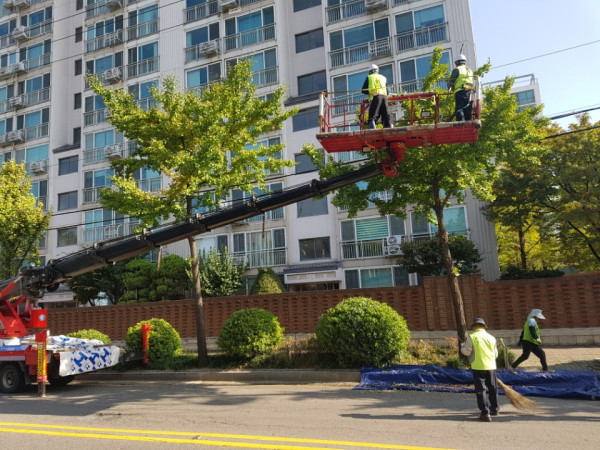 서울 마포구가 성큼 다가온 가을을 맞아 쾌적한 보행환경을 조성하고자 악취가 발생하는 은행나무 열매 조기 채취 작업에 들어갔다. 사진은 현장기동반이 은행나무 열매를 수거하고 있는 모습. (사진제공=마포구청)
