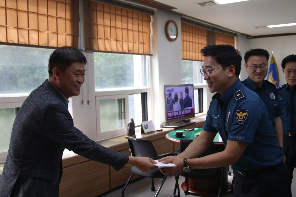 지난 18일 이용기 서울남부보훈지청장(왼쪽)이 추석을 맞아 어려운 환경에서 근무하고 있는 의무경찰 등을 위로·격려하기 위해 서초경찰서를 방문해 노고에 감사와 존경을 표하고 위문금을 전했다. (사진제공=서울남부보훈지청)