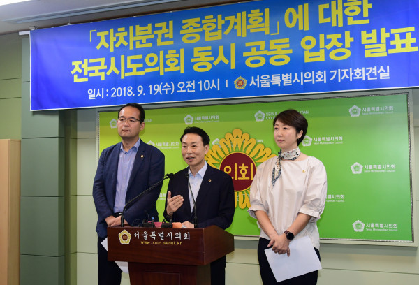 [시민일보=이진원 기자] 김정태 서울시의회 지방분권 테스크포스(TF) 단장 등 의원 3명이 19일 열린 기자회견에서 신원철 의장을 대신해 ‘민주주의 근간인 주민참여제도 본질을 정부는 왜곡해서는 안된다’는 취지의 ‘자치분권 종합계획 대한 전국시·도의회의 공동입장문’을 발표했다.