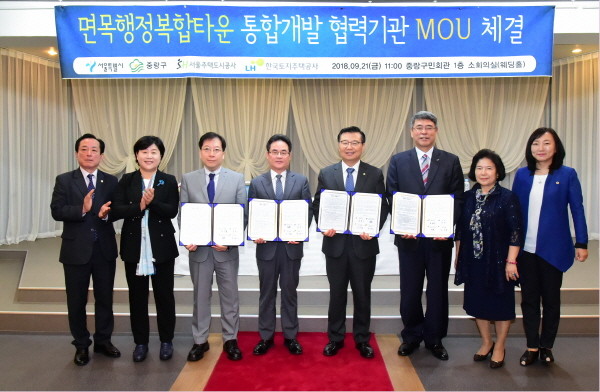 중랑구는 지난 21일 오전 11시 중랑구민회관에서 서울시, 서울주택도시공사(SH), 한국토지주택공사(LH)와 면목행정복합타운 통합개발 추진을 위한 협력 양해각서를 체결했다. 사진은 협약식에 참석한 조희종 구의장(왼쪽부터), 서영교 국회의원, SH 김세용 사장, 류 훈 서울시주택건축국장, 류경기 구청장, 홍현식 LH 서울지역본부장, 강금선 면목4동 주민자치위원장, 이영실 시의원 등이 기념촬영을 하는 모습.(사진제공=중랑구청)