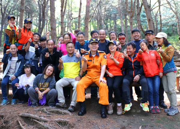 경기 오산소방서와 오산여성의용소방대는 26일 추석명절을 맞이해 독산성 산림욕장에서 성심동원 소속 장애인 20명을 대상으로 레크리에이션 활동을 진행했다. 사진은 레크리에이션에 참여한 참가자들이 기념촬영을 하는 모습. (사진제공=오산소방서)