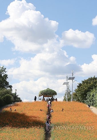완연한 가을 날씨를 보인 27일 오후 서울 송파구 올림픽공원 들꽃마루에서 시민들이 노랑 코스모스 밭에서 가을을 만끽하고 있다.