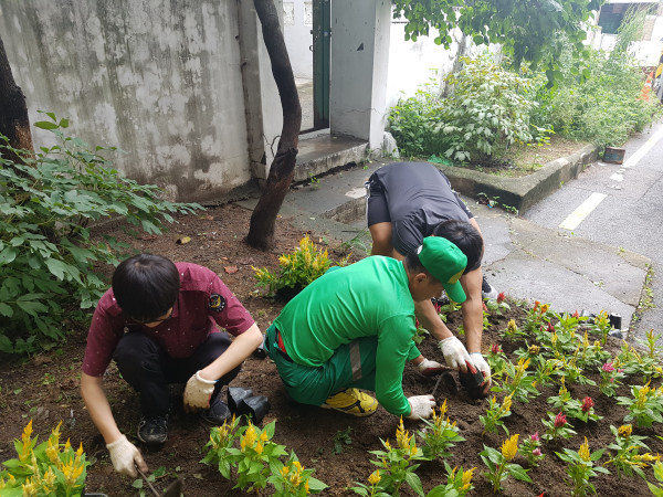 경기 수원시 영통구 매탄1동은 최근 지역내 우성아파트 삼거리, 선우장미 연립, 가마니골 경로당, 매화초등학교, 공영주차장 일대에서 잡초를 뽑고 그 자리에 맨드라미 1000본을 식재했다. 사진은 참여자들이 맨드라미를 심고 있는 모습. (사진제공=수원시청)
