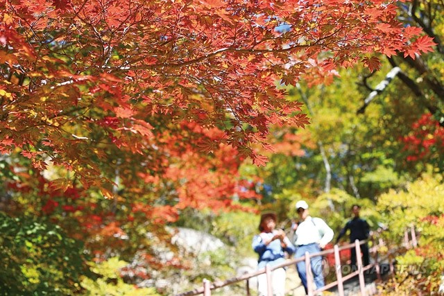 설악산 단풍이 시작된 이후 첫 휴일을 맞은 30일 산행에서 나선 등산객들이 서북 능선 구간에서 단풍을 만끽하고 있다.