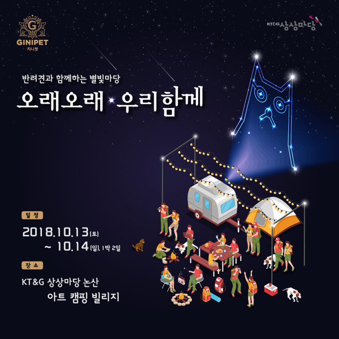 이번 캠프는 반려견을 동반한 총 30팀을 선착순 모집하며, 참가신청은 지니펫 홈페이지 및 상상마당 홈페이지를 통해 10월 7일까지 가능하다.