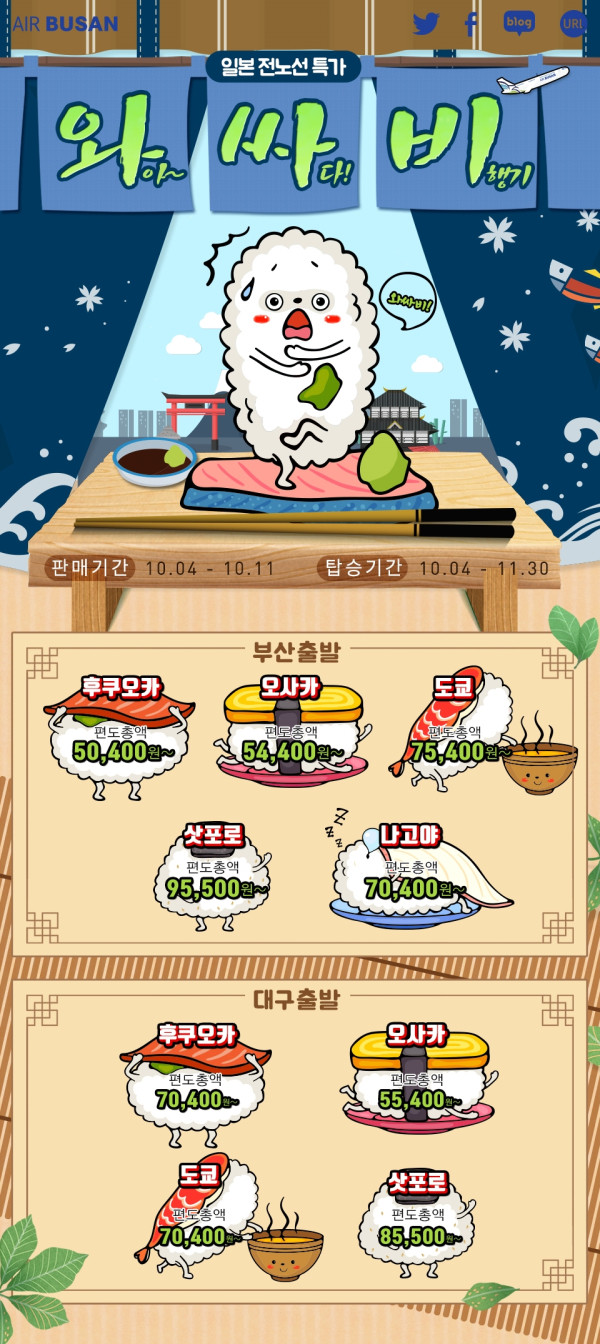 이번 이벤트는 4일(목) 오전 11시부터 11일(목)까지 에어부산 홈페이지와 모바일에서 진행된다. 에어부산이 취항하는 일본지역 전 노선 대상이며, 탑승 기간은 오는 10월 4일(목)부터 11월 30일(금)까지다.