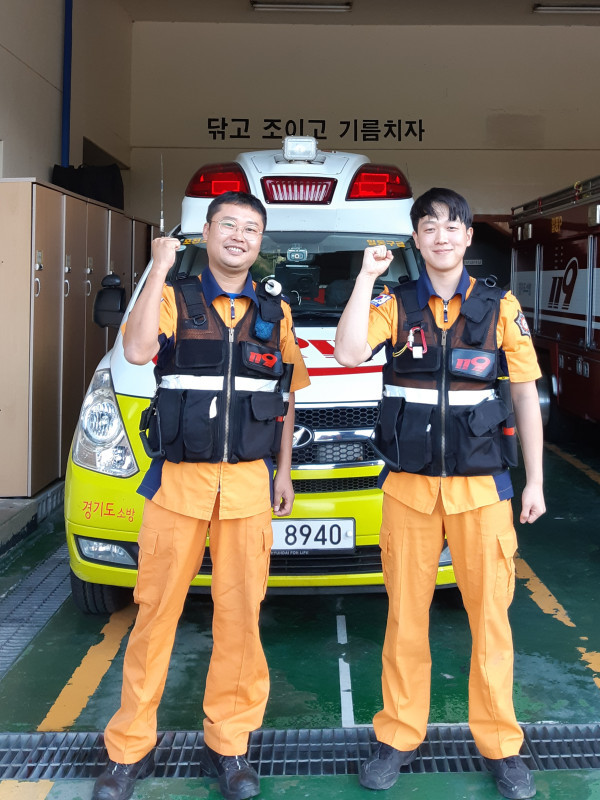경기 포천소방서 119구급대 이정은·채재성 소방대원은 최근 추석 성묘길에 심정지가 발생한 환자에 대해 신속한 응급조치를 진행해 소중한 생명을 구했다. 사진은 심정지 환자 사망사고를 막은 이·채 대원의 모습. (사진제공=포천소방서)
