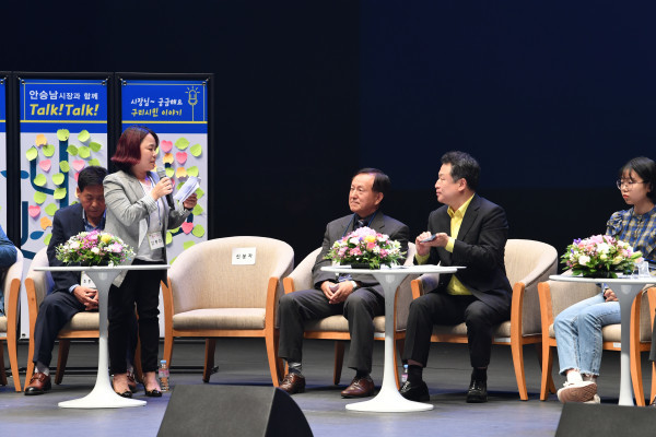 경기 구리시가 지난 9월29일 구리아트홀 코스모스대극장에서 '구리, 시민행복특별시' 출범 92일을 맞이해 '안승남 시장과 함께하는 행복 토크콘서트'를 진행했다. 사진은 참가자가 안 시장(오른쪽에서 두번째)에게 의견을 밝히고 있는 모습. (사진제공=구리시청)