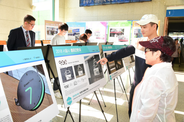 2일 서울 중랑구청을 방문한 주민들이 구청 로비에서 열리고 있는‘좋은 간판 전시회’의 사진을 둘러보고 있다. 구는 ‘간판이 아름다운거리 조성사업’의 일환으로 구청 로비에서 오는 5일까지 좋은간판 사진전을 개최하고 있다. (사진제공=중랑구청)