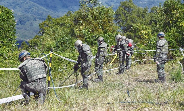 2일 강원도 철원군 5사단 인근 비무장지대에서 군인들이 지뢰제거 작업을 하고 있다. 남북은 군사분야 합의서에서 10월 1일부터 20일까지 판문점 지뢰부터 제거하기로 했다. 같은 날 시작되는 화살머리고지 지뢰제거는 11월30일까지 끝내기로 했다.