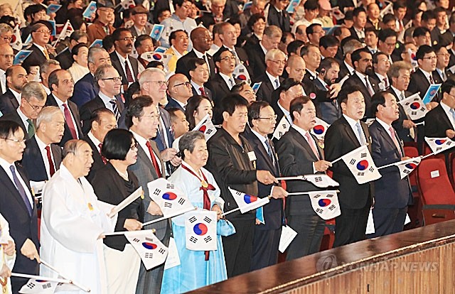 이낙연 국무총리(앞줄 왼쪽 네번째)를 비롯한 참석자들이 3일 오전 서울 종로구 세종문화회관 대극장에서 열린 제4350주년 개천절 경축식에서 개천절 노래를 부르고 있다.