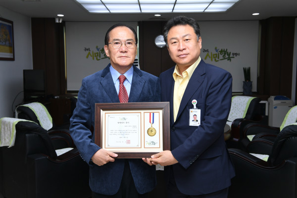 안승남 경기 구리시장은 지난 2일 시장 집무실에서 김재남 구리시 강원도민회 자문위원을 강원 삼척시 명예대사로 위촉하고, 위촉장을 수여했다. 사진은 안 시장(오른쪽)과 김 명예대사가 위촉장을 들고 기념촬영을 하는 모습. (사진제공=구리시청)