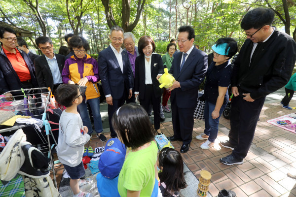 3일 서울 강남구 수서동 탄천공원에서 ‘강남페스티벌 수서 탄천공원 플리마켓’이 개최됐다. 사진은 플리마켓을 방문한 정순균 구청장(오른쪽 세번째)이 한 어린이가 판매하고 있는 물건을 살펴보며 대화를 나누고 있다. (사진제공=강남구청)