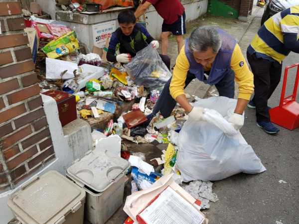 성북구 장위1동 주민센터는 최근 '쓰레기 신속처리반' 발대식을 열고 본격적인 활동에 들어갔다. 사진은 지역내 무단투기 쓰레기를 수거하고 있는 신속처리반의 모습. (사진제공=성북구청)