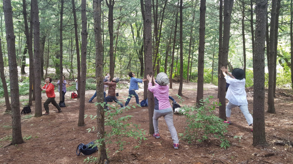 | ▲ 산림치유프로그램에 참여한 지역주민들이 프로그램에 참여하는 모습. (사진제공=노원구청) | ||