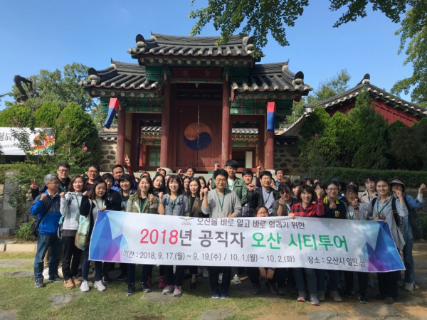 경기 오산시가 지난 9월17일부터 이달 2일까지 총 5회에 걸쳐 시청 직원을 대상으로 ‘공직자 시티투어 체험행사’를 진행했다. 사진은 공직자 시티투어에 참석한 시 관계자들이 탐방지에서 기념촬영을 하는 모습. (사진제공=오산시청)