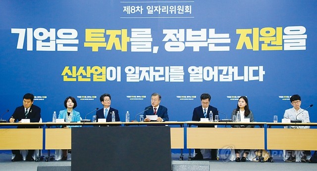 문재인 대통령이 4일 오전 충북 청주 SK하이닉스 ‘M15’에서 열린 제8차 일자리위원회에서 발언하고 있다. 문 대통령은 “좋은 일자리를 만드는 것은 결국 기업”이라며 “(고용 문제의 어려움을) 타개하기 위해 기업의 투자를 촉진하고 일자리를 더 많이 만들어 내도록 활력을 회복하는 데에 집중하겠다”고 말했다.