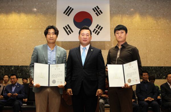 서울 강동구의회 박원서 운영위원장(강일동, 고덕1·2동)이 최근 강동구 태권도협회 주관으로 열린 ‘제11회 강동구협회장기 태권도 겨루기 및 시범경연대회’에 참석해 생활체육 대중화와 협회 발전에 기여한 유공자에게 감사장을 수여했다. 사진은 감사장 수여 후 유공자들과 기념촬영을 하고 있는 박원서 위원장(가운데)의 모습. (사진제공=강동구의회)