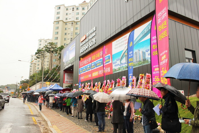 | ▲ 방문객들이 이른 아침부터 우산을 쓰고 ‘검단오류역 우방 아이유쉘’ 모델하우스 입장을 기다리고 있다. | ||