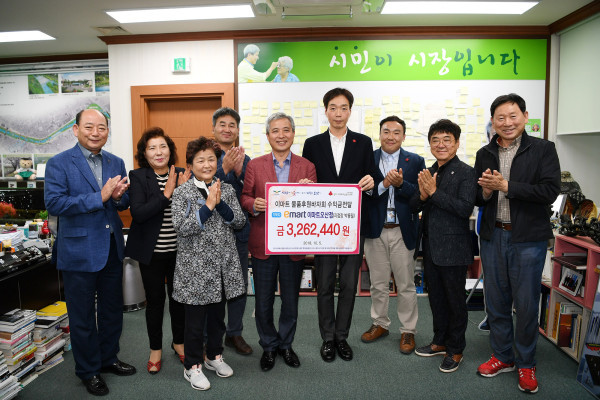 경기 오산시 원동 소재 이마트 오산점이 최근 열린 ‘제3회 어울림 오산 나눔박람회 사랑의 바자회’를 통해 마련한 기금을 지난 5일 오산시청에 기탁했다. 사진은 곽상욱 시장과 이마트 관계자 등이 기탁증을 들고 기념촬영을 하는 모습. (사진제공=오산시청)