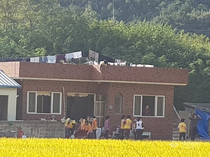 최근 발생한 제25호 태풍 콩레이 (KONG-REY)로 인해 경북 영덕군 축산 2리 마을회관 인근 농가들이 큰 피해를 입었다. 사진은 마을 주민들과 봉사자들이 피해 복구 작업을 진행하고 있는 모습.