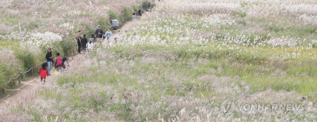 한글날인 9일 휴일을 맞아 서울 마포구 하늘공원을 찾은 시민들이 억새밭 사이를 산책하며 가을 정취를 만끽하고 있다.