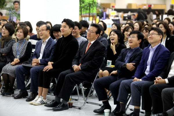 11일 정순균 강남구청장(왼쪽)이 구청 본관 1층에서 직원 200여명과 함께 하는 ‘순균c와 함께하는 기분 좋은 데이트’를 열고, 직원들과 소통의 시간을 보냈다. 사진은 정 구청장이 직원과 함께 기념영상을 보며 즐거워하고 있는 모습. (사진제공=강남구청)