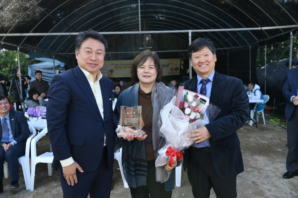 경기 구리시 장애인종합복지관에서 운영하는 발달 장애인 힐링농장은 11일 발달 장애인들이 참가한 가운데 가든파티를 개최했다. 사진은 안 시장이 관계자들에게 표창을 수여한 후 기념촬영을 하는 모습. (사진제공=구리시청)