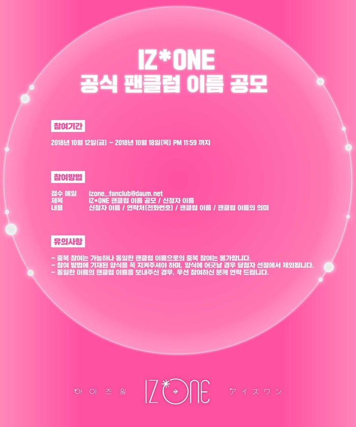 아이즈원은 12일 오후 12시 1분 공식 팬카페 및 SNS 채널들을 통해 공식 팬클럽 이름 공모를 공지하는 게시물을 올렸다.