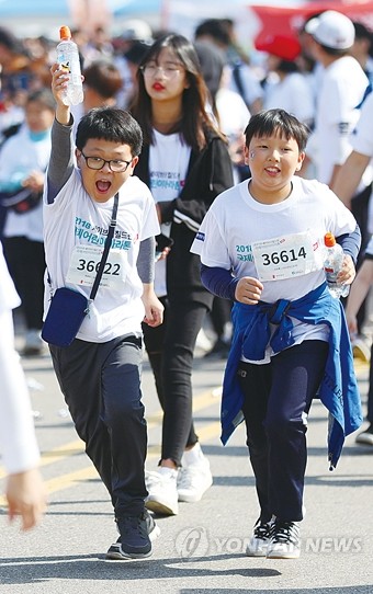 14일 오전 서울 마포구 서울월드컵공원 평화광장에서 국가기간뉴스통신사 연합뉴스와 국제구호단체 세이브더칠드런 공동 주최로 열린 '2018 국제어린이마라톤'에서 참가 어린이들이 출발 신호에 맞춰 힘차게 뛰고 있다. 국제어린이마라톤 참가 비용 전액은 말리와 방글라데시의 5세 미만 영유아 보건 사업에 사용된다.