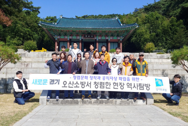 경기 오산소방서가 지난 12일 ‘청렴의식 함양을 위한 현충사 방문행사’와 함께 ‘직원간 소통을 위한 워크숍’을 개최했다. 사진은 충남 아산시에 위치한 현충사를 방문한 소방서 관계자들이 기념촬영을 하는 모습. (사진제공=오산소방서)