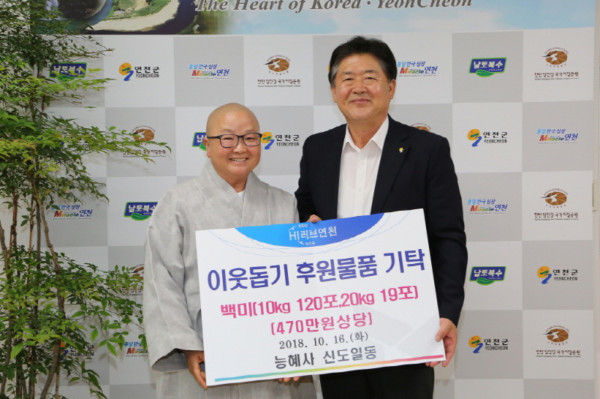 경기 연천군은 16일 전곡읍에 위치한 능혜사로부터 지역내 저소득 취약계층 및 홀몸노인 가구를 위한 10kg 백미(120포)와 20kg 백미(19포) 등 139포를 기탁받았다. 사진은 기탁식에 참석한 김광철 군수(오른쪽)과 법조 스님의 모습. (사진제공=연천군청)