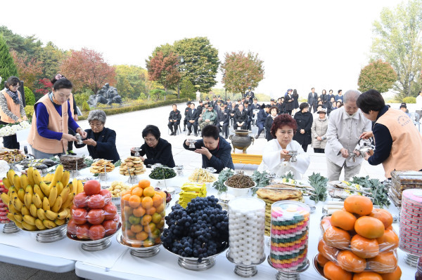 전몰군경미망인회 경기 하남시지회가 17일 현충탑에서 국가와 민족을 위해 희생한 호국영령들의 넋을 위로하는 ‘호국영령 위령제’를 거행했다. 사진은 위령제에 참석한 전몰군경미망인들이 제를 올리는 모습. (사진제공=하남시청)