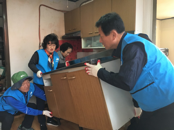 경기 양주시 양주1동 지역사회보장협의체는 16일 취약계층의 주거환경 개선을 위한 ‘희망홀씨 사랑의 집고치기’를 실시했다. 이날 참여자들은 벽 페인팅, 단열 도배, 장판교체, 싱크대 교체 등의 집수리를 진행했다. 사진은 참여자들이 싱크대를 옮기고 있는 모습. (사진제공=양주시청)