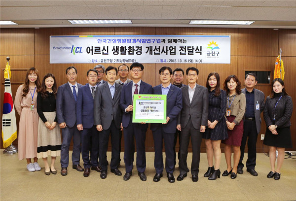금천구는 16일 구청 기획상황실에서 한국건설생활환경시험연구원과 ‘어르신 생활환경 개선사업’ 전달식을 가졌다. 이번 사업은 시설 보수가 필요한 구 경로당을 대상으로 한 사회공헌활동으로, 한국건설생활환경시험연구원은 금천현대아파트 경로당 등 4곳에 총 500만원 상당의 환경개선 사업비를 지원했다. 사진은 관계자들이 기념촬영을 하는 모습. (사진제공=금천구청)