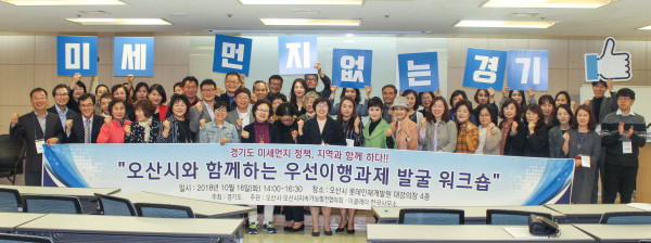 경기 오산시는 16일 롯데인재개발원에서 ‘미세먼지 대책 진단 및 우선이행과제 발굴 워크숍’을 개최했다. 사진은 워크숍에 참석한 참가자들이 행사 종료 후 기념촬영을 하는 모습. (사진제공=오산시청)