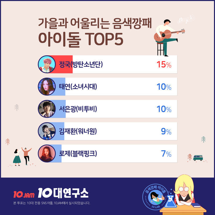 방탄소년단 정국이 ‘10대들이 뽑은 가을에 가장 잘 어울리는 음색을 가진 아이돌 멤버’ 1위로 선정됐다.