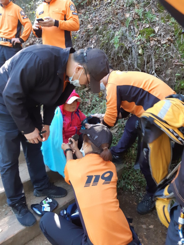17일 인천계양소방서 119구조·구급대가 계양산 중턱 산악 위치표지판 G-22 지점에 할머니가 쓰러져 있다는 등산객의 신고를 받고 출동해 인명구조 활동을 펼쳤다. 사진은 길에 쓰러져 있는 할머니의 상태를 살피고 있는 구급대원들의 모습. (사진제공=인천계양소방서)
