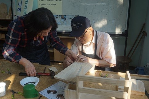 5번째로 진행된 ‘시니어 보훈공방 스토리’ 사업은 복권기금과 부산산림교육센터의 지원으로 어르신들이 스케치부터 재단, 못 박기, 사포질까지 모든 제작과정에 직접 참여해 수납함, 독서대, 플레이팅 도마 등 다양한 작품을 만드는 프로그램이다.