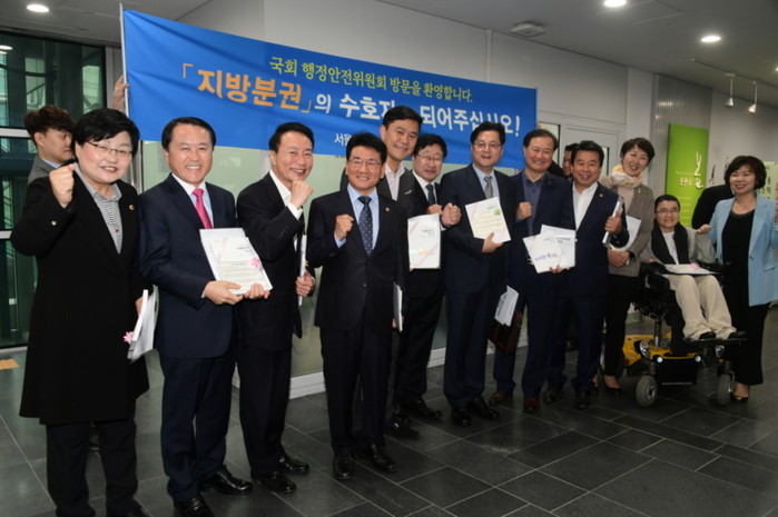 서울시의회 김생환 부의장과 김정태 지방분권 테스크포스(TF) 단장을 비롯한 시의원들은 지난 18일 국회 행정안전위원회 국정감사 현장을 방문해 지방의회 위상 정립을 위한 국회의 적극적인 협조를 요청하는 ‘지방분권 촉구 퍼포먼스’를 진행했다. 사진은 김 부의장을 비롯한 시의원들과 국회 행안위원장인 인재근 의원을 비롯한 국회의원들이 기념촬영을 하는 모습.(사진제공=서울시의회)