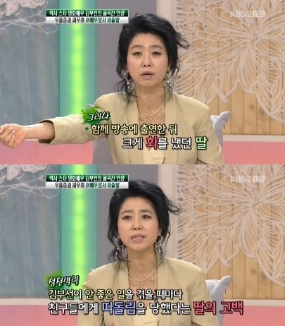 과거 방송된 KBS2 ‘여유만만’에 출연한 김부선은 지난 SBS 강심장 출연 이후 딸과의 사이가 멀어졌음을 고백했다.