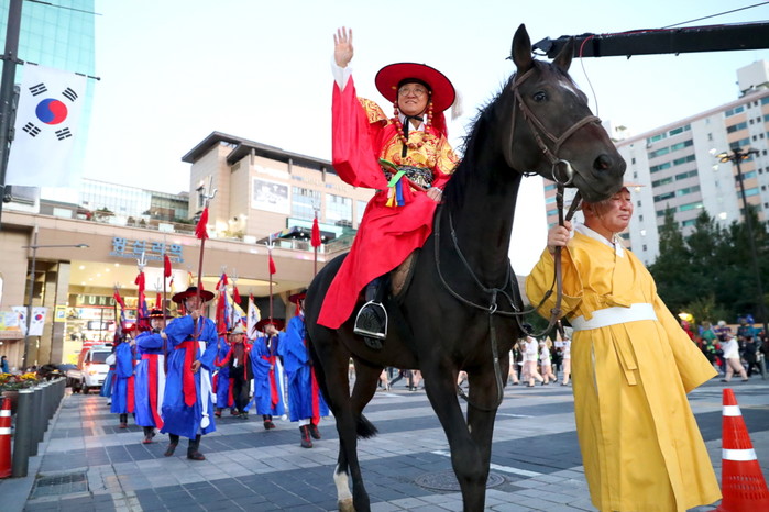 구는 축제 첫날인 지난 19일 오후 6~7시 취타대와 호위군 100여명이 선두를 이끌고, 200여명의 지역주민이 후미에서 함께하는 ‘태조 이성계 사냥행차 거리 퍼레이드’를 진행했다.