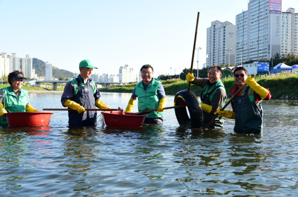 최근 류경기 서울 중랑구청장(가운데)이 겸재교 아래 중랑천에서 새마을지회 주관으로 열린 '새마을지회 중랑천가꾸기' 행사에 참석해 새마을지도자들과 함께 중랑천 오물 수거작업에 동참했다. 사진은 류 구청장 및 참여자들이 중랑천에서 타이어를 건져내며 웃고 있는 모습. (사진제공=중랑구청)