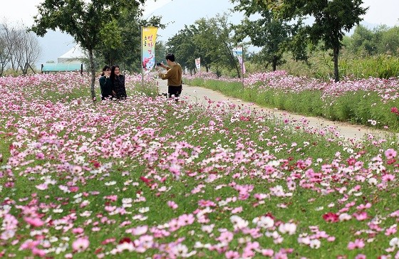 밀양시 초동면 반월습지 주변 산책길에 코스모스가 활짝 피었다. ‘코스모스연가길’이라고 이름 붙여진 이 산책 코스는 낙동강 반월습지와 함께 어울려 아름다운 자연경관을 보여주고 있어 많은 사람들이 찾는 명소가 되고 있다.