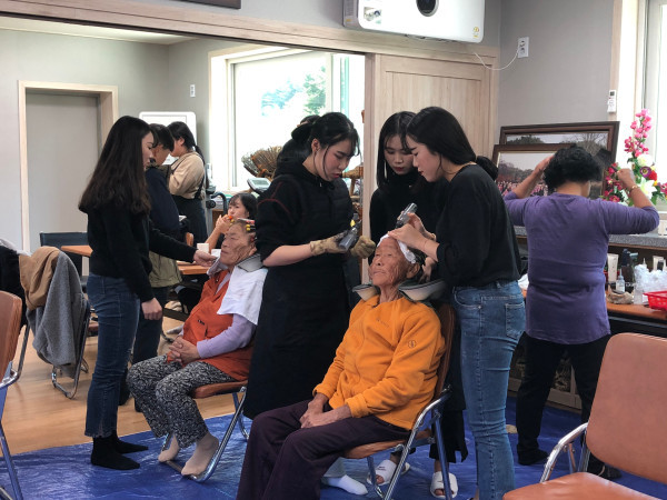 경기 양평군 양동면행복돌봄추진단은 지난 20일 양동고등학교 학생 20여명과 함께 양동면 소재 계정1리 마을회관을 방문해 지역노인 50여명을 대상으로 ‘경로잔치 행사’를 진행했다. 사진은 학생들이 노인들의 머리를 손질하고 있는 모습. (사진제공=양평군청)