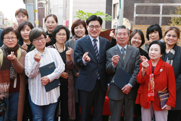 23일 이정훈 서울 강동구청장이 마을과 사람이 만나 마을 안에서 배움과 성장을 하는 지역네트워크 활동 거점 공간인 ‘성내어울터’ 개소식에 참석해 개관을 축하했다. 사진은 이 구청장이 개소식에 참여한 주민· 관계자들과 함께 기념촬영을 하고 있는 모습. (사진제공=강동구청)