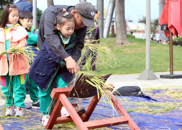 서울 금천구는 23일 오전 10시~오후 6시 구청 광장과 금나래 중앙공원 일대에서 도심 속 ‘가을걷이’ 행사를 진행했다. 사진은 ‘가을걷이’ 행사에서 전통적인 방식인 ‘홀테’를 이용해 탈곡을 하고 있는 어린아이의 모습. (사진제공=금천구청)