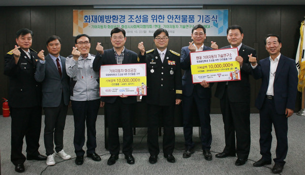 경기 화성소방서는 지난 22일 소방서 소회의실에서 기아자동차 화성공장 및 현대·기아자동차 기술연구소로부터 화재예방 환경 조성을 위한 안전물품을 기탁받았다. 사진은 소방서 및 현대·기아차 관계자들이 기념촬영을 하는 모습. (사진제공=화성소방서)
