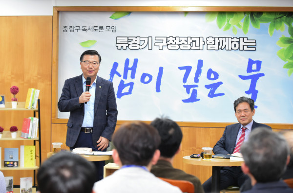 중랑구는 지난 22일 구청 기획상황실에서 류경기 구청장, 구민, 직원들이 함께 하는 독서토론모임 '샘이 깊은 물'을 개최했다. 이번 독서모임의 도서는 망우역사문화공원에 묻힌 역사적 인물들의 이야기를 엮은‘그와 나 사이를 걷다’로, 책의 저자인 김영식 작가도 함께 참여했다. 사진은 류 구청장이 인사말을 하는 모습. (사진제공=중랑구청)
