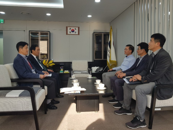 박윤국 경기 포천시장은 24일 국토교통부 산하 서울시방국토관리청을 방문해 김일평 청장을 면담하고, 국도 관련 계획에 포천지역 국도사업을 반영해줄 것을 건의했다. 사진은 박 시장 등 관계자들이 이야기를 나누고 있는 모습. (사진제공=포천시청)